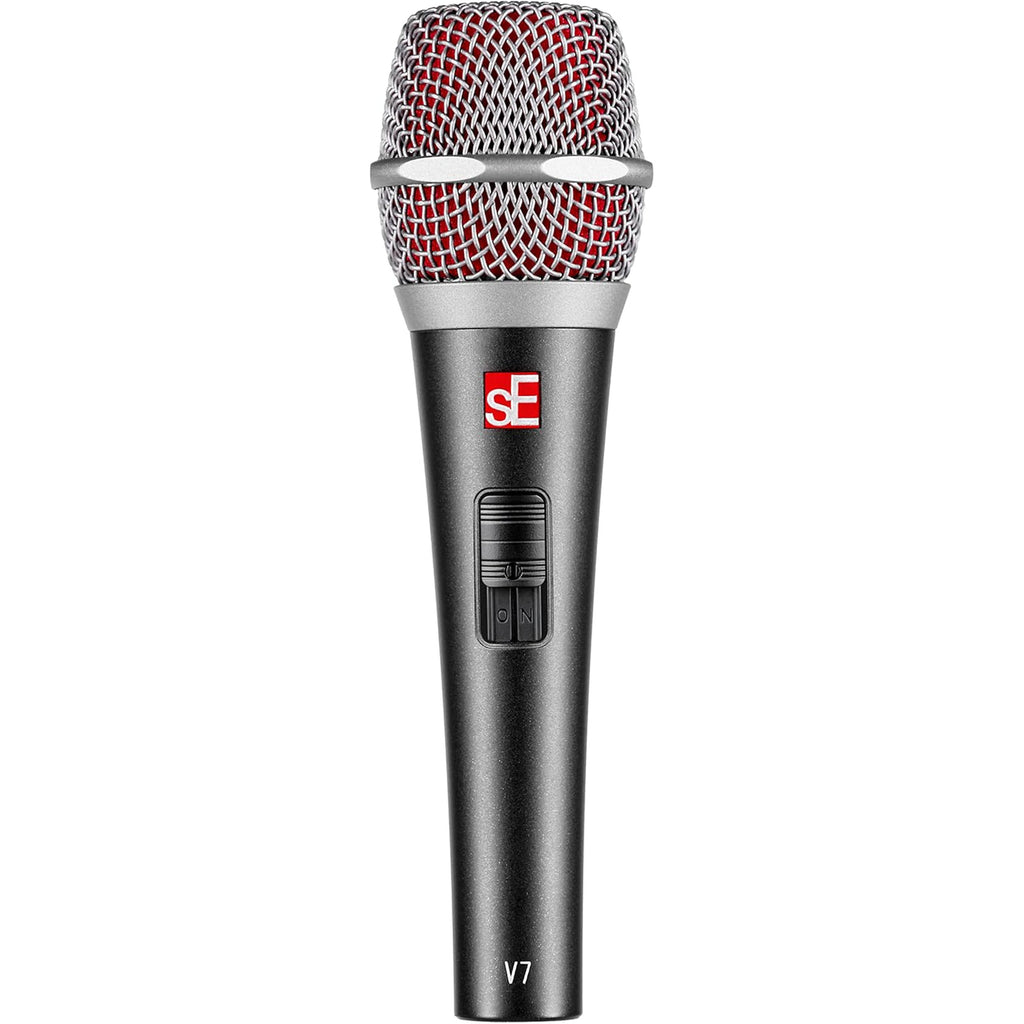 The sE Electronics V7 is a high-performance music microphone designed for today's demanding live sound environments. With a specialized supercardioid aluminum voice coil, rugged all-metal construction, and outstanding feedback rejection, the V7 singing mic delivers the clarity, durability, and reliability that touring professionals expect from their music equipment. When used with the available V7 MC1 wireless capsule, the V7 becomes a wireless microphone you can trust whether handheld or stand-mounted. A patented shockmount system keeps handling noise to a minimum, while the switchable internal windscreen tames unwanted wind and plosive noise. With both red and black windscreen color options included to match your setup and style, this XLR dynamic microphone adapts to your needs. Recommended for vocals, speech, podcasting, broadcasting, electric guitar, and drums, the V7 vocal mic captures every performance with definition and control. The supercardioid capsule of this DJ microphone delivers impressive isolation, allowing for higher gain before feedback, so your vocals stay clear and strong, even on loud stages. The result: natural, expressive vocals with every nuance intact. Durability comes standard with all sE dynamic microphones. The housing of the V7 cardioid microphone is crafted from highly durable zinc alloy, paired with a beveled, corrosion-resistant spring steel grille that's dent-proof and designed to keep your XLR mic in place when set down. Every element of the V7 is engineered for real-world performance - on stage, on camera, and in the studio. Built to handle the demands of live shows and recording alike, the V7 excels as a streaming mic, a podcast microphone, and a reliable piece of stage & sound equipment. It's a true microphone for content creators - one that captures your voice with precision while standing up to the pressure of any performance.