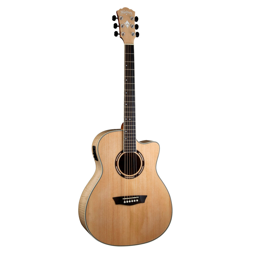 Washburn apprentice Series guitars are for the serious beginner who wants an acoustic that sounds great, plays great and will last. The AG40CE is a Grand Auditorium style acoustic featuring a cutaway and a custom Barcus-Berry LX4 pickup tuner system for superior acoustic tone when plugged in. A select spruce top and flame maple back and sides provide tonal projection. The mahogany neck features a rosewood fingerboard with offset dot inlays and flame maple capped headstock with chrome diecast tuners.