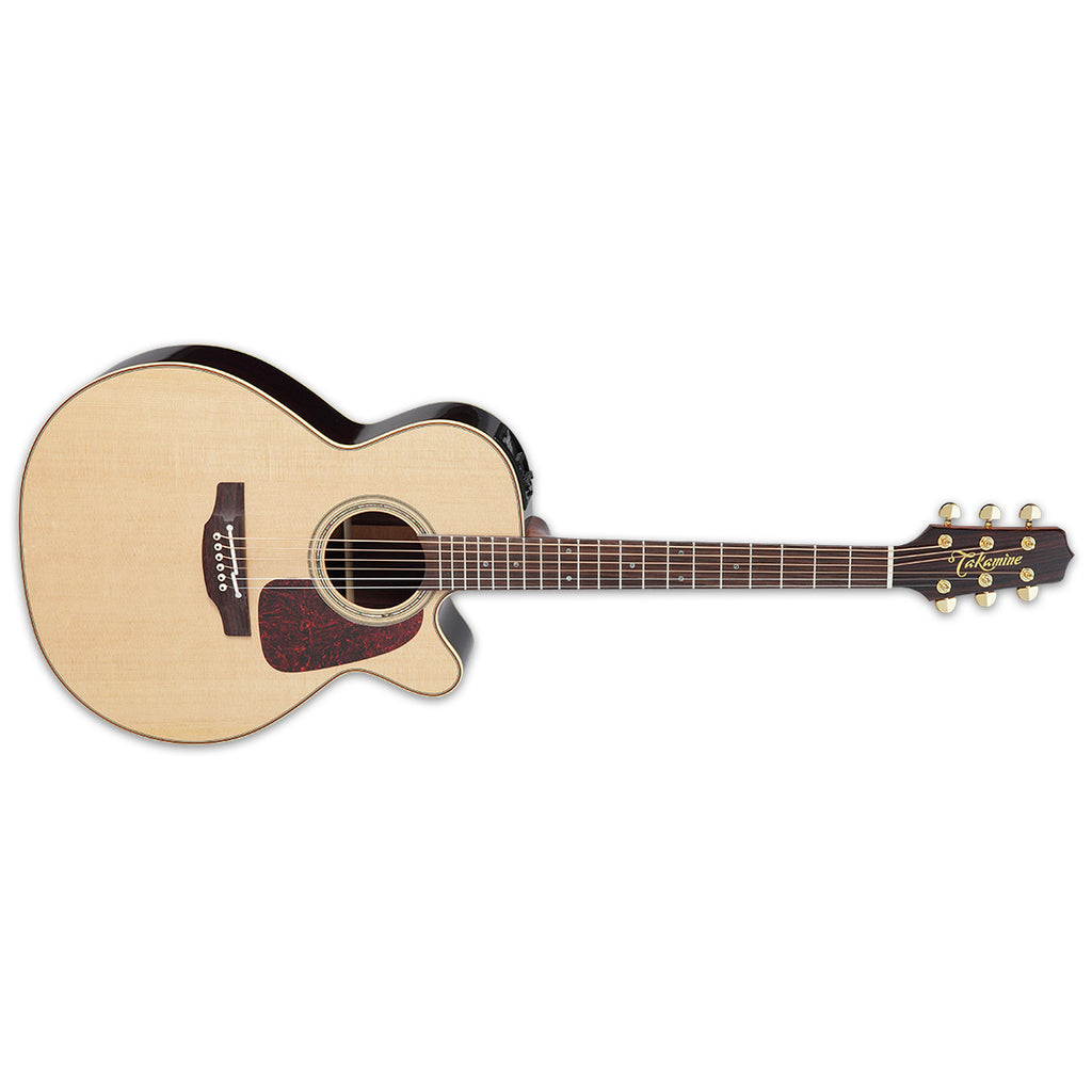 With Takamine's distinctive NEX body style, the P5NC is a singer's delight, combining the power of a dreadnought with balanced tone that perfectly complements the vocal range. It features a resonant solid spruce top with scalloped "X" top bracing for superior balance and articulation, solid rosewood back and rosewood sides, a convenient Venetian cutaway for easy access to the upper reaches of the fingerboard, and elegant ivoroid body binding with dark wood purfling and abalone rosette. Built with the performer in mind, the P5NC features Takamine's proprietary CT4-DX preamp system paired with the unique Palathetic™ under-saddle pickup for peerless amplified response. Other performance-enhancing features include Takamine's asymmetrical neck profile - which is slightly thinner on the bass side so that it fits the natural shape of your hand, resulting in a comfortable feel and improved playability. The split bone saddle provides more accurate intonation, while bridge pin positioning optimizes the break angle to improve sustain and presence. Premium design appointments include a rosewood fingerboard with abalone "dot-in-dot" inlays, a rosewood headcap, gold tuners with gold buttons, a natural bone nut and gloss natural finish. The P5NC comes complete with a premium archtop hardshell case.